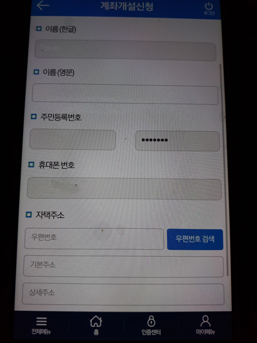 8. 우리종합금융 계좌개설을 위해 영문이름 및 자택주소 입력후 다음버튼 클릭